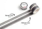 Washi tape designs with beautiful vintage lace in black color. These were created using scans of real antique lace, making them look incredibly realistic. Choose between our two designs: border lace (15mm) or delicate lace (20mm).