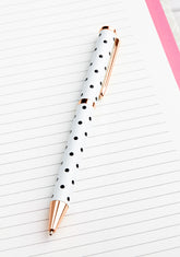These super cute, polka-dotted, twist-type ballpoint pens come in 2 different colors: gold and rose gold. Smooth writing with black ink.