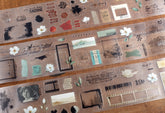This transparent PET tape features a clear backing sheet, making it ideal for fussy cutting and testing the placement of cut-out stickers before use.