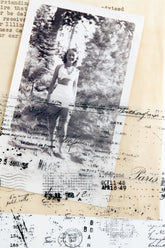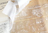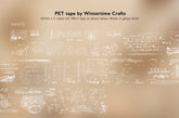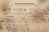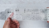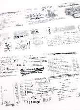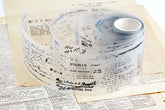 PET tape featuring many grunge-style vintage details and retro elements, such as handwritten text, postmarks, ledger details, grids, numbers, and French text. One of our most versatile designs to date! Available in black or white print.
